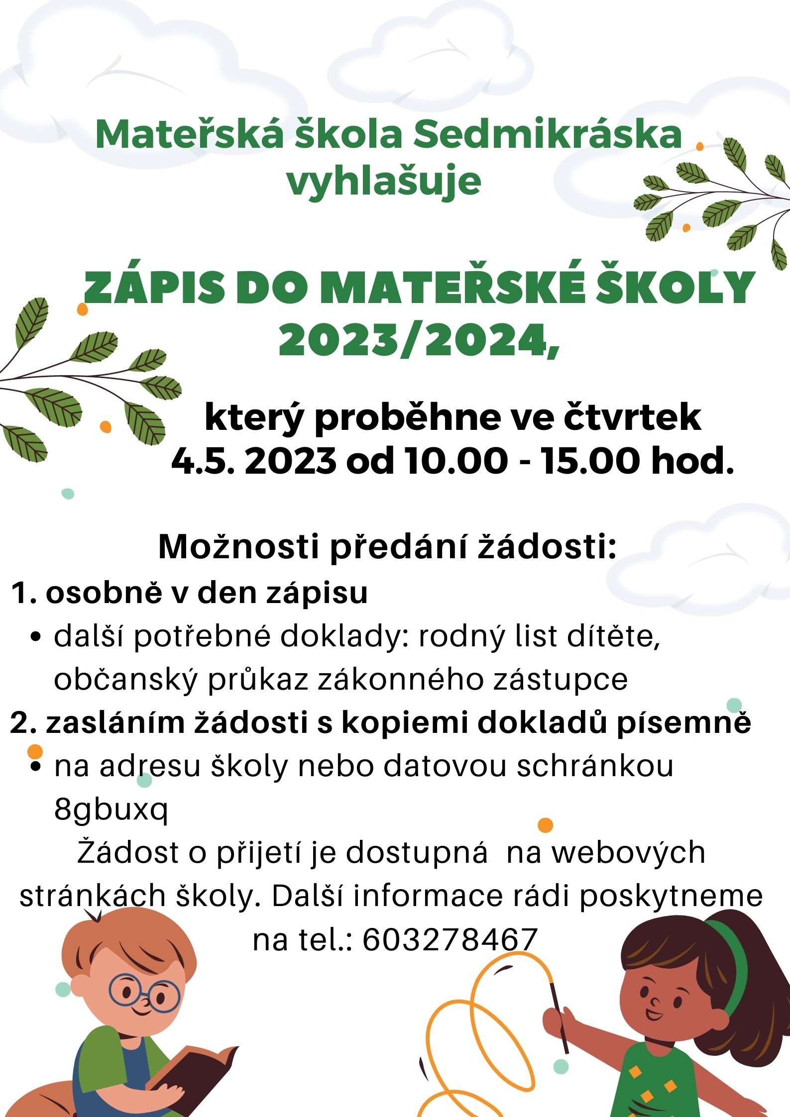 - Dítě, které nejpozději k 31. 8. 2023 dovrší věk 4 let, je řádně očkováno dle § 50 zákona č.258/2000 Sb., o ochraně veřejného zdraví, v platném znění a které má trvalý pobyt, v případě cizinců místo pobytu v Horní Vsi.